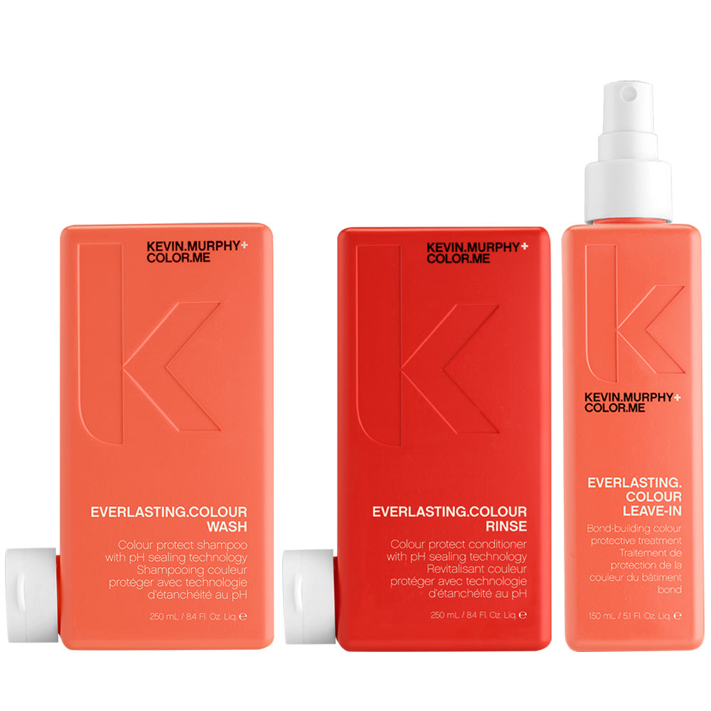 Ett TRIO-pack med färgbevarande Schampo + Conditioner med en ny pH-bevarande teknologi som låser in färgen i håret och tillför samtidigt en vacker glans samt en leave-in spray som kommer att bli din every day boost. Färgbevarande schampo med pH-bevarande teknologi Ett sulfatfritt pH-balanserat schampo som skonsamt rengör stänger fjällskiktet för glans och bidrar till att bevara färgen samtidigt som det skyddar hårstråna mot beläggningar av mineraler från hårt vatten för att garantera glans. Fördelar enligt Mr Kevin Murphy EVERLASTING. COLOUR WASH innehåller en sur pH-förseglingsteknik som rengör skonsamt samtidigt som det naturliga pH-värdet i hårbotten bevaras och fjällskiktet försluts för att ge en strålande glans. Det hjälper till att bevara färgen längre och skyddar mot mineralbeläggningar som också kan vara en stor anledning till att färgen inte ser lika bra ut som dagen du lämnade salongen. Huvudingredienser som bidrar till detta är hydrolyserat quinoaextrakt inulin risproteiner och ett tekniskt avancerat komplex som binder samman det hela. Egenskaper och fördelar Surt pH-schampo Bevarar färgen Skapar glans Skyddar mot mineraler i hårt vatten Ger näring och återfuktar ViktlösFärgbevarande balsam med pH-bevarande teknologi Ett färgbevarande balsam som bildar ett skyddande lager som förhindrar färgförluster och miljöpåfrestningar. pH-balansering bidrar till att skapa glans och förbättra hårets skick mjukhet och fukthalt samtidigt som den minskar skador utan att tynga ner håret. Fördelar enligt Mr Kevin Murphy EVERLASTING. COLOUR RINSE har utvecklats för att skydda mot skador. Produkten återställer fjällskiktet för att bevara hårfibrernas styrka från rot till topp. När den används tillsammans med de övriga produkterna i produktfamiljen bidrar den till att återuppbygga hårets integritet samtidigt som den ger näring och stärker. Vår superfood-blandning av ingredienser tillsammans med den bästa teknik som labbet kan erbjuda håller ditt hår starkt och friskt. Ingredienser som ekologisk olja från svartkummin risproteiner och inulin från cikoriarot ger färgskydd kombinerat med ny teknik som de ILLUMINATE- och CHROMATIC-komplex vi utvecklat för att förstärka resultaten. Egenskaper och fördelar Surt pH-schampo Bevarar färgen Skapar glans SÅterställer håret Ger näring och återfuktar ViktlösFärgskyddande behandling med bond-building-teknologi Lätt leave in-spray som behandlar håret från insidan för att öka hårets motståndskraft för förbättrat starkare och friskare hår. Bevarar färgen och skyddar håret mot miljöpåverkan samtidigt som det ger näring återfuktar och reparerar. Din every day boost! Fördelar enligt Mr Kevin Murphy EVERLASTING. COLOUR LEAVE-IN kan användas varje dag och utgör en daglig boost av skydd mot färgblekning på grund av miljöföroreningar och fria radikaler tillsammans med UVA/UVB-skydd. Vi utnyttjade vetenskapliga rön och har adderat bond-building-egenskaper och teknik som låser pH-värdet i denna viktlösa spray. Eftersom vi gillar att hämta ingredienser från naturen bidrar extrakt av Moringa Oleifera-frö till att reparera och skydda mot miljöföroreningar och Risproteiner tillför motståndskraft. Denna teknik bidrar till att stärka inifrån för att öka hårets motståndskraft för förbättrat starkare och friskare hår. Allt detta sker utan att håret tyngs ned och utan beläggningar. Egenskaper & Fördelar Surt pH-värde Bevarar färgen Skapar glans Bond-building Skyddar mot yttre påverkan Reparerar stärker och är utredande