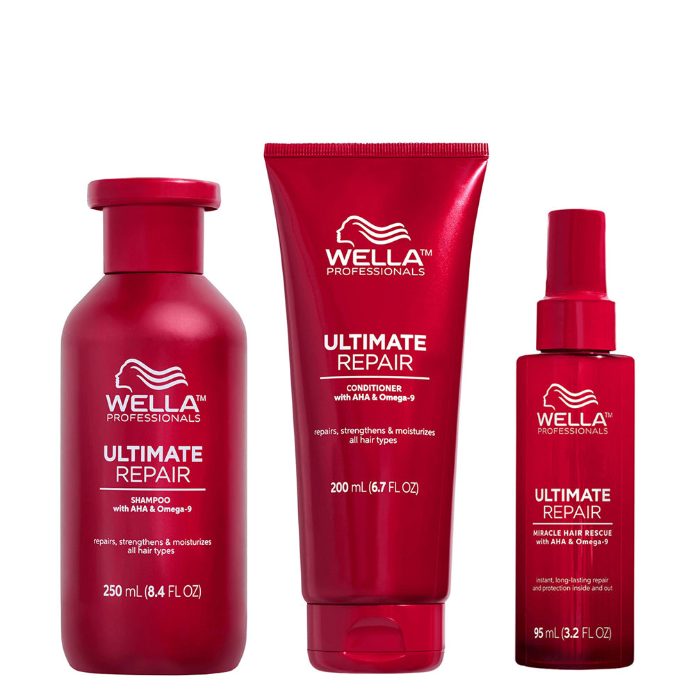 En ny lyxig och helt unik hårvårdserie som reparerar ditt skadade hår inifrån och ut. Och det med hjälp av AHA som återuppbygger de skadade svavelbindningarna inne i hårstrået och med Omega 9 för att återställa hårets utseende på utsidan. Den här 3-stegs hårvårdsrutinen reparerar ditt hår snabbt och effektivt. Komplettera sedan gärna med Ultimate Repair Protective Leave-in!STEP 1 Shampoo 250 ml Ett djuprengörande schampo. Detta löddrande lättviktiga schampo med patenterad Metal Purifier-teknik hjälper till att avlägsna orenheter som kan orsaka skador på håret och börjar återuppbygga håret inifrån och ut. Innehåller alfahydroxisyra och omega 9. Den lätta formulan rengör håret med ett lyxigt lödder och gör att det ser friskt glänsande och lent ut. STEP 2 Conditioner 200 ml Uppnå starkare friskare och glansigare hår efter varje användning med detta balsam. Ett balsam för daglig användning som synligt reparerar skadat hår innehåller en patenterad teknologi som kombinerar alfahydroxisyra (AHA) och omega 9. AHA återuppbygger bindningarna i fiberstammen för en stark hårkärna och Omega 9 återställer fjällskiktet i värme- och blekskadat hår för att återskapa dess skyddande barriär. Parabenfri och passar alla hårtyper . STEP 3 Miracle Hair Rescue 95 ml En riktigt lyxig leave-in-spray som reparerar skadat hår på bara 90 sekunder. Efter en användning blir håret 12 gånger slätare och synligt förändrat med 99 % färre avbrutna hårstrån och legendarisk glans som varar i upp till fyra tvättar. Innehåller alfahydroxisyra (AHA) som återuppbygger hårets inre styrka och omega 9 som återställer utsidan på värme- och blekskadat hår.