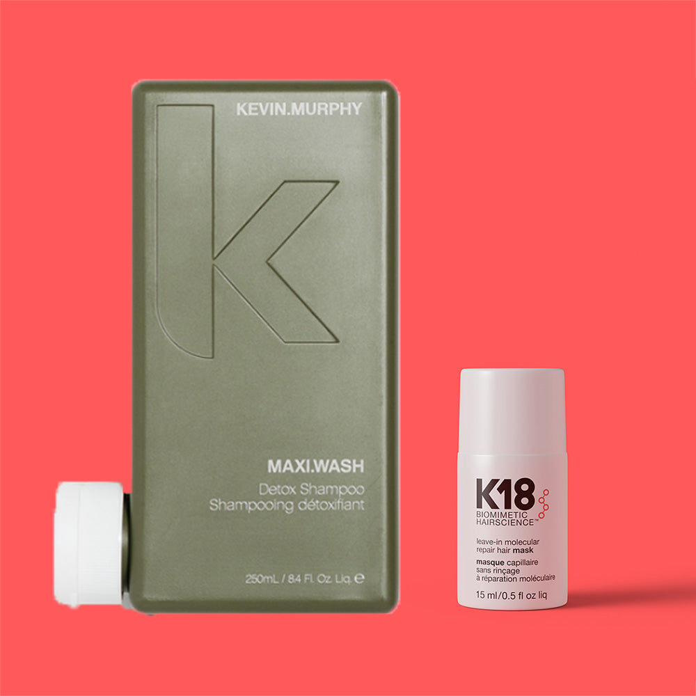 Kevin Murphy Maxi Wash Detox Shampoo 250ml Ett exfolierande schampo som bryter ned fettsyror för en maximalt ren hårbotten utan att skada håret eller huden. Schampoot innehåller balanserande oljor för att lugna och skapa balans i hårbotten samt lindrar klåda och irritationer. Perfekt för dig med ett stressat hår. K18 Leave-in Mask är hårindustrins genombrott som kliniskt bevisat återställer keratinkedjor som har brutits och skadats till dess ursprungliga och ungdomliga tillstånd. K18 skapar ett mjukt frissfritt glansigt och starkt hår på bara fyra minuter. Ju mer skadat håret är desto bättre blir resultatet. K18 passar för alla hårtyper . K18 Peptide™ är unikt. Det är en patenterad bioaktiv peptid som kommer att bana väg för nästa generations hårvård. K18 är inte bara en tillfällig lösning. Det är den första produkten som använder biomimetik för att återställa keratinkedjor.