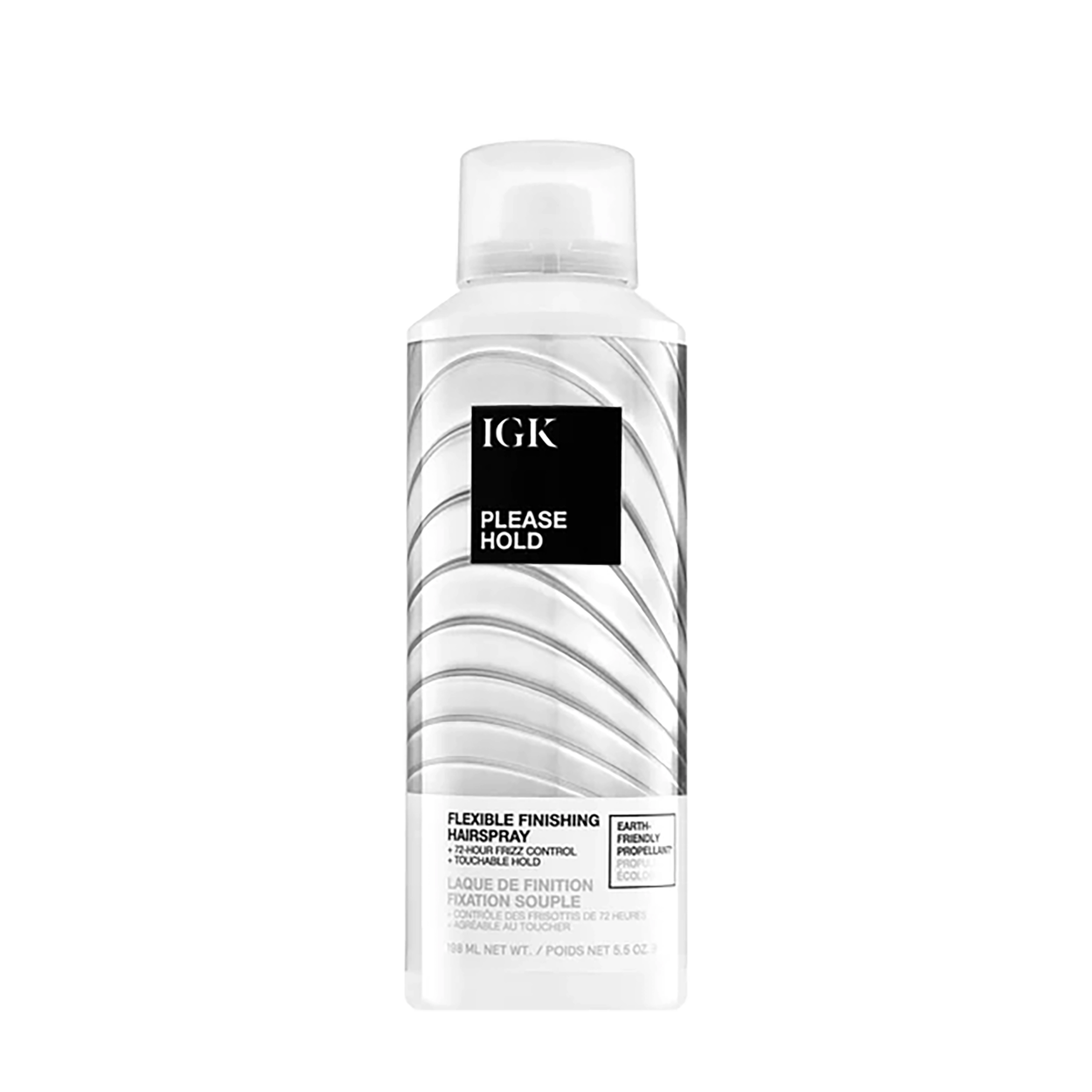 IGK Please Hold Hairspray är en flexibel finisher som låser frisyren med glans och kontroll utan att håret känns hårt. Erbjuder frizz‑skydd i upp till 72 timmar och innehåller camellia‑olja som ger polerad finish. Miljövänlig propellant och viktlös känsla.